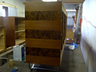 We normally dis-assemble cabinets somewhat to have more of a uniform finish (ie: handles, glass, doors, drawers out and sometimes the back removed if the inside is to be done) and this was definitely no exception, especially since it was being readied for a museum. (I am not privelaged to know which museum yet, unfortunately, but excited about the prospect, nonetheless)