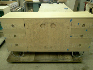 I am also restoring several other pieces from this same series (an Upright bar cabinet and tea cart), as well as a maple barrel chair designed by him. I will also post some pics of these as they are completed. For now, we'll focus on the credenza..